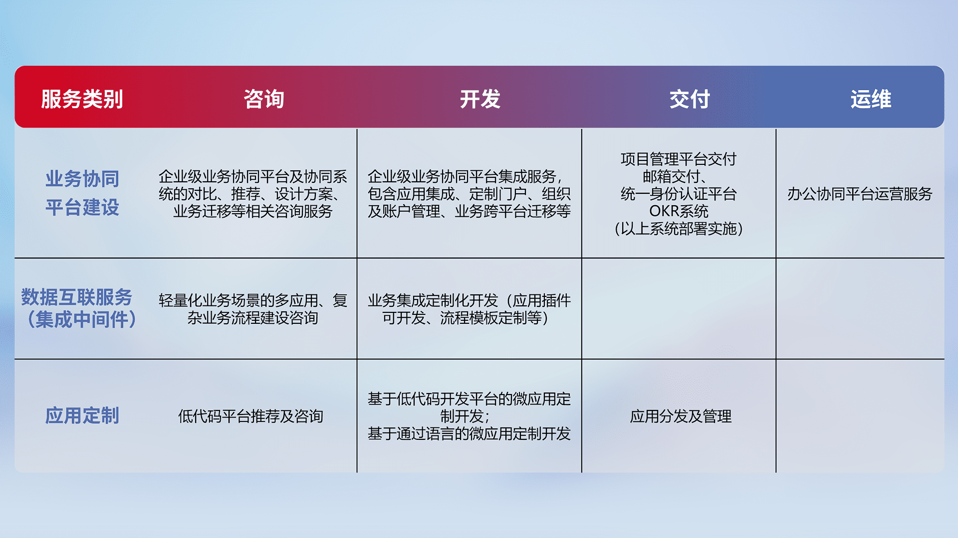 针对钉钉、、、企微、、、、IDaas等平台级产品提供产品的规划、、、方案、、、交付、、定制化开发等服务,,,,实现如统一协同办公、、、、智能客户服务、、混合会议管理、、智能数据查询、、、等业务场景,,实现数字化转型。。